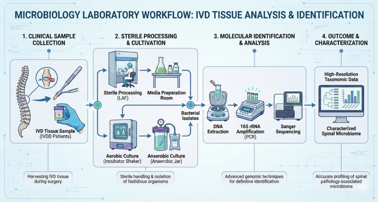 Our Microbiology Laboratory specializes in the bacteriological investigation of Intervertebral Disc Disease (IVDD) by analyzing the IVD tissue samples harvested during surgical procedures. From the IVDD patients. Equipped with Laminar Air Flow (LAF) systems and a media preparation room, we ensure the sterile processing of IVD disc tissues. A core component of our lab'sMicrobiology workflow is the ability to culture fastidious organisms; utilizing incubator shakers and anaerobic jars, we perform rigorous screening methods to isolate both aerobic and anaerobic bacteria inhabiting the disc tissue..